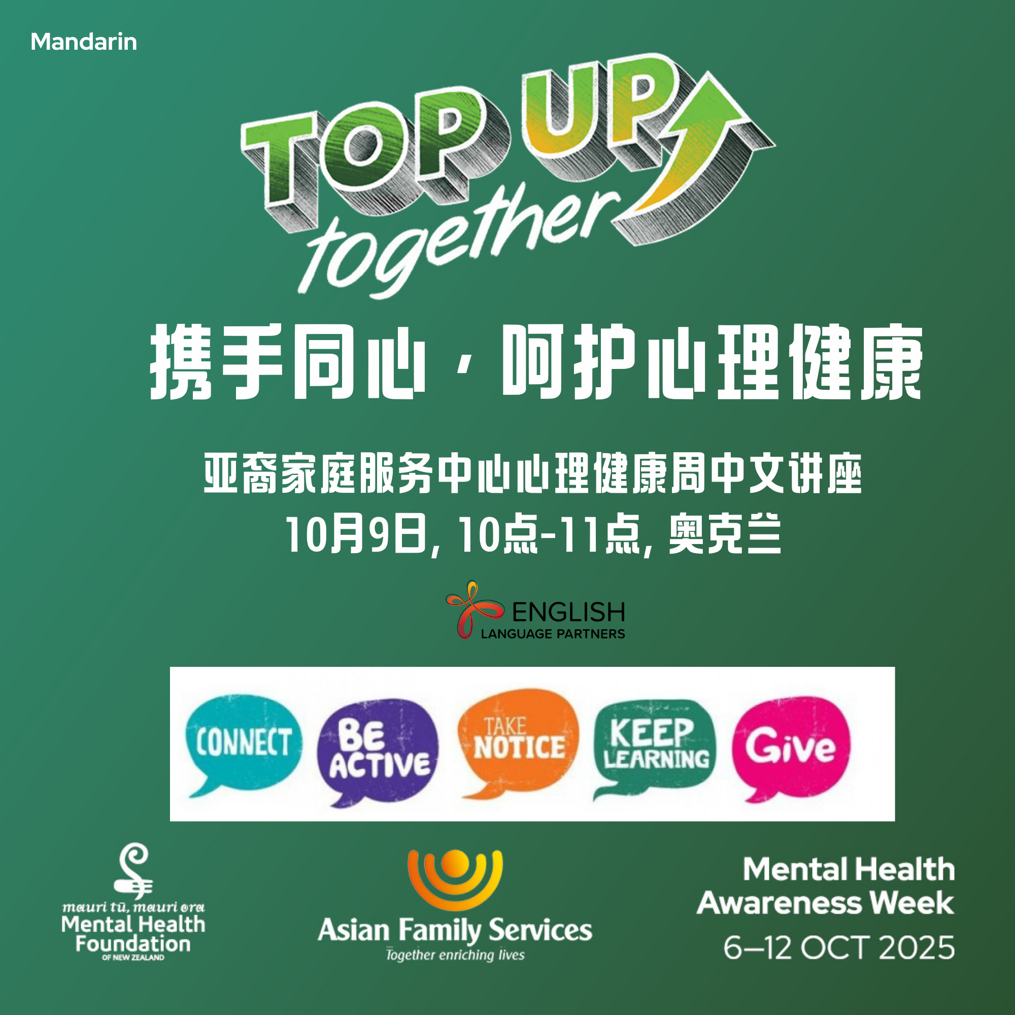Asian Family Services plans to conduct mental health wellbeing workshops, themed “Topping up together with the Five Ways to Wellbeing,” across New Zealand during Mental Health Awareness Week 2025. The purpose of these workshops is to provide information about mental health and equip the Asian community with practical skills related to the Five Ways to Wellbeing.