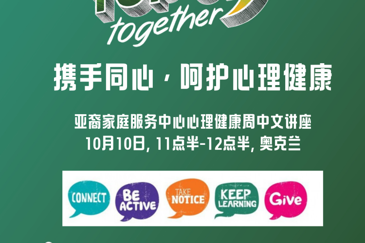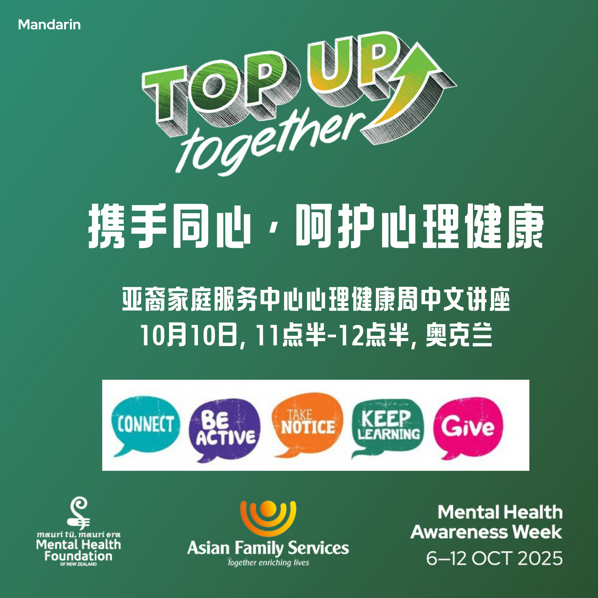 Asian Family Services will conduct mental health wellbeing workshops, themed 'Topping up together with the Five Ways to Wellbeing' across New Zealand during Mental Health Awareness Week 2025. The purpose of the workshop is to provide information about mental health and equip the Asian community with practical skills related to the Five Ways to Wellbeing.