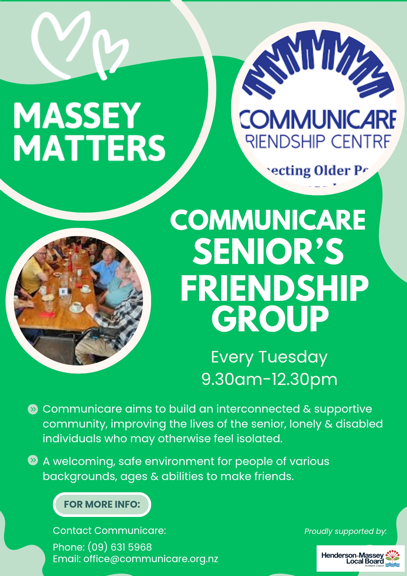 This Mental Health Awareness Week, join us at the FREE Seniors Friendship Group with Communicare at Massey Community Hub on Tuesday 7th October, 9.30amâ12.00pm.
