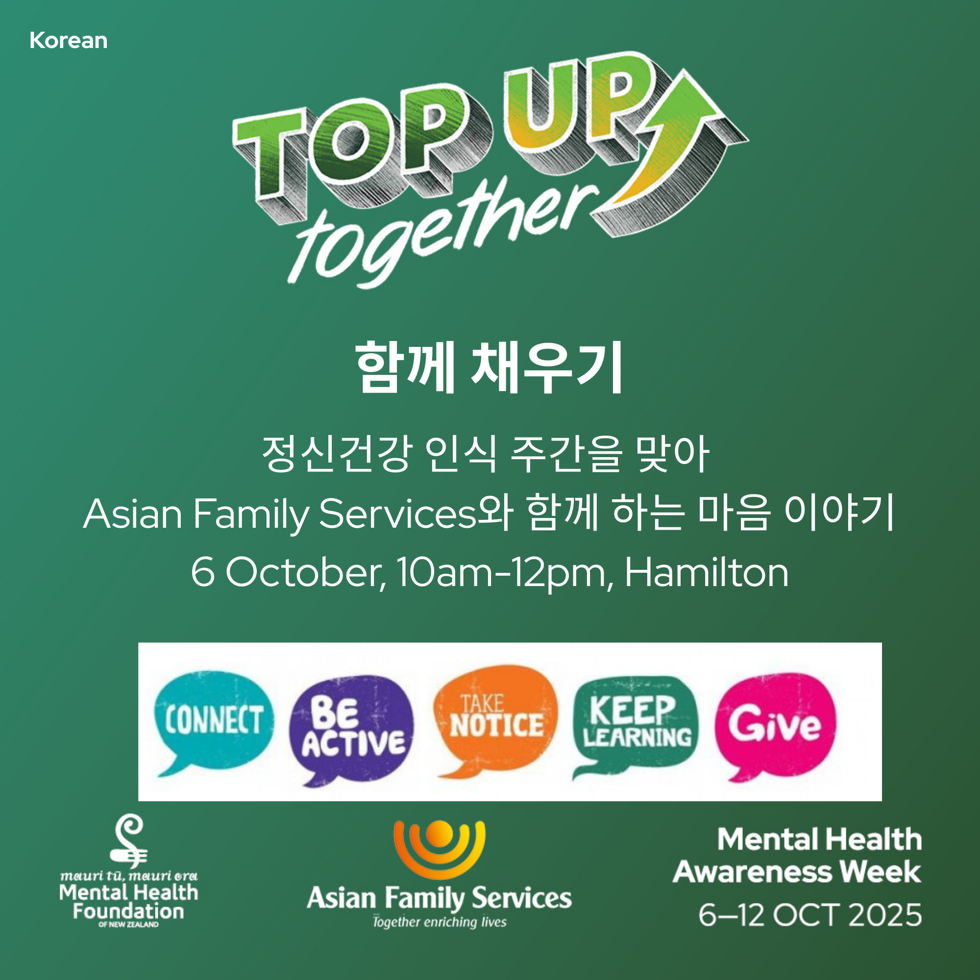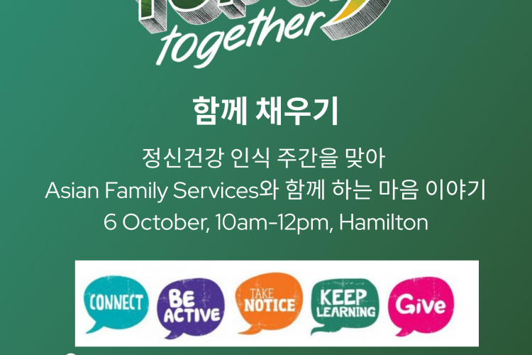 Asian Family Services will conduct mental health wellbeing workshops, themed 'Topping up together with the Five Ways to Wellbeing' across New Zealand during Mental Health Awareness Week 2025. The purpose of the workshop is to provide information about mental health and equip the Asian community with practical skills related to the Five Ways to Wellbeing.