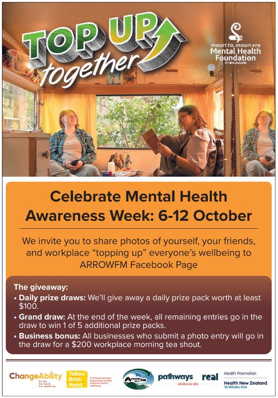This October Wairarapa will join the rest of Aotearoa in celebrating Mental Health Awareness Week (MHAW). In partnership with ArrowFM 92.7 – the Wairarapa’s only Community Access Radio Station – and local social service organisations such as ChangeAbility Yellow Brick Road and the National Public Health Service, are excited to bring the Mental Health Foundation’s 2025 theme “Top Up Together” to life in our community.