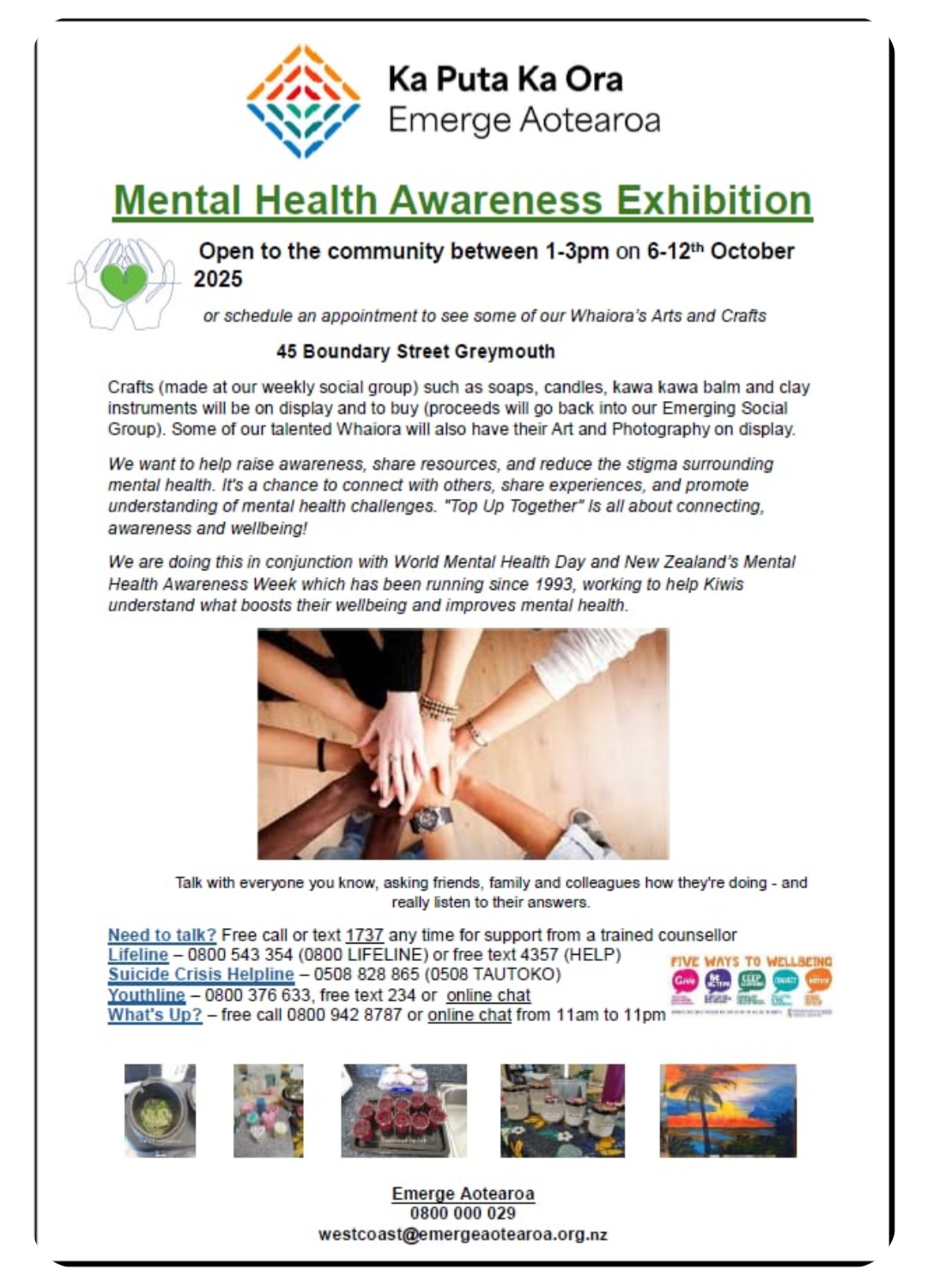 We are celebrating mental health awareness week with our tangata whaiora by welcoming in our community. Isolation is very common on the west coast, so we help by bringing our tangata whaiora together by doing arts, crafts, cooking or just being us. During mhaw we are inviting our community in to come and see our whaiora's art and crafts and try our tangata whaiora's baking, which will be made on the day. We would like to raise awareness around mental health, isolation and community support. No one has to do life alone.